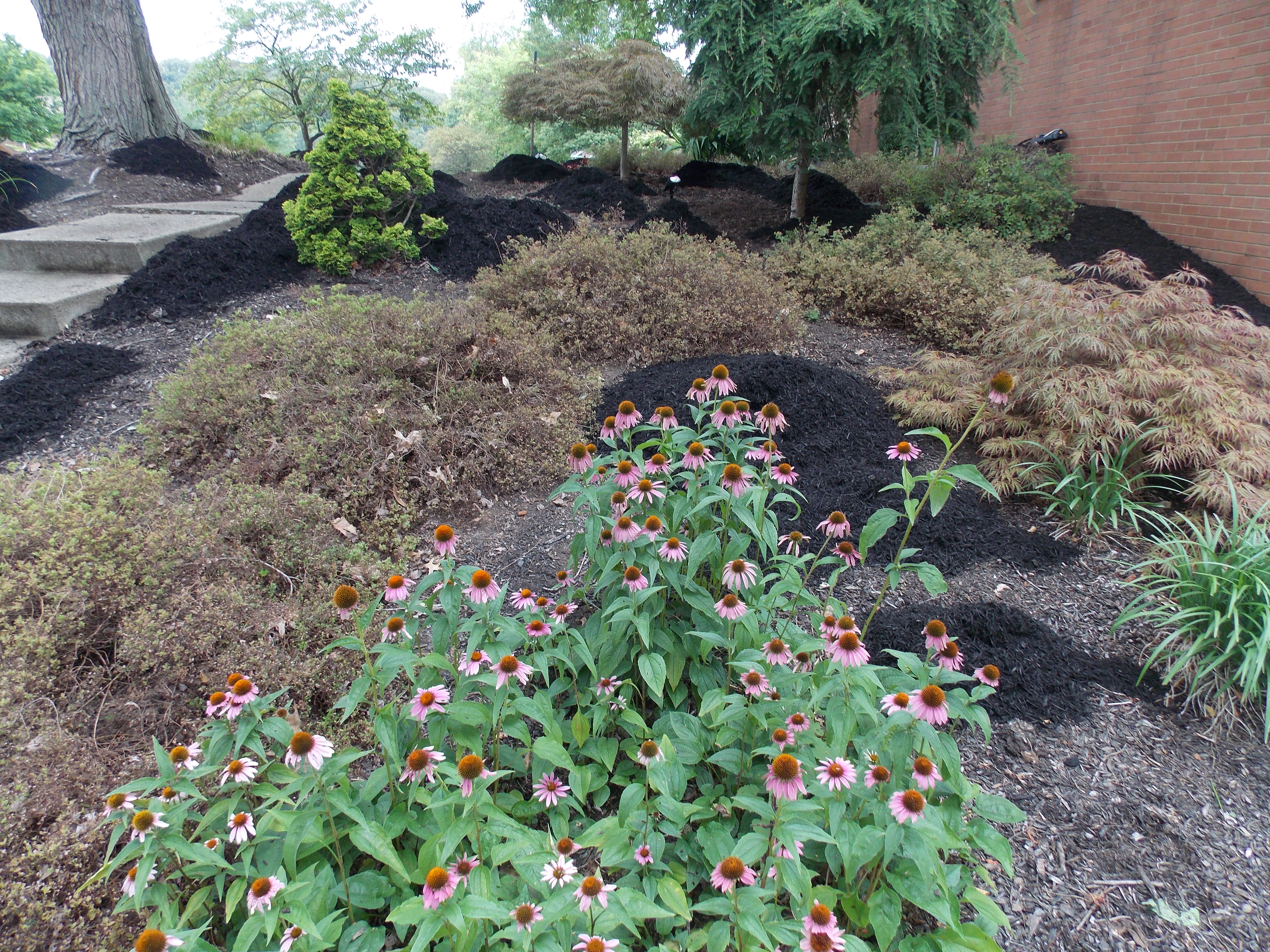 Among the things I enjoyed about the job was the variety. We’re not doing the same thing day after day, the way I might in a factory or warehouse. I run the mowers and weed-whackers. I prepare beds for mulch and I wheelbarrow the mulch to the beds and place it when it arrives. I pick up branches and out-of-place things in yards and trim the shrubs. I also weed, pulling up all the green things growing in places they weren’t intended to grow.