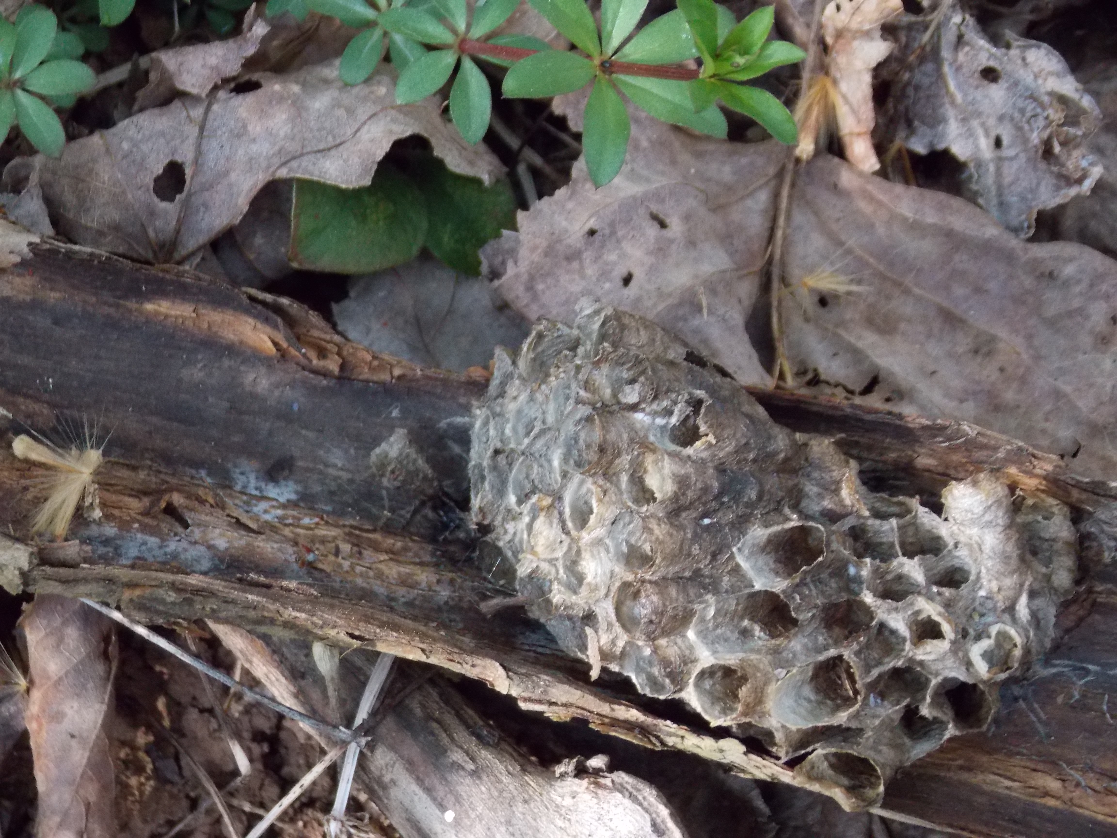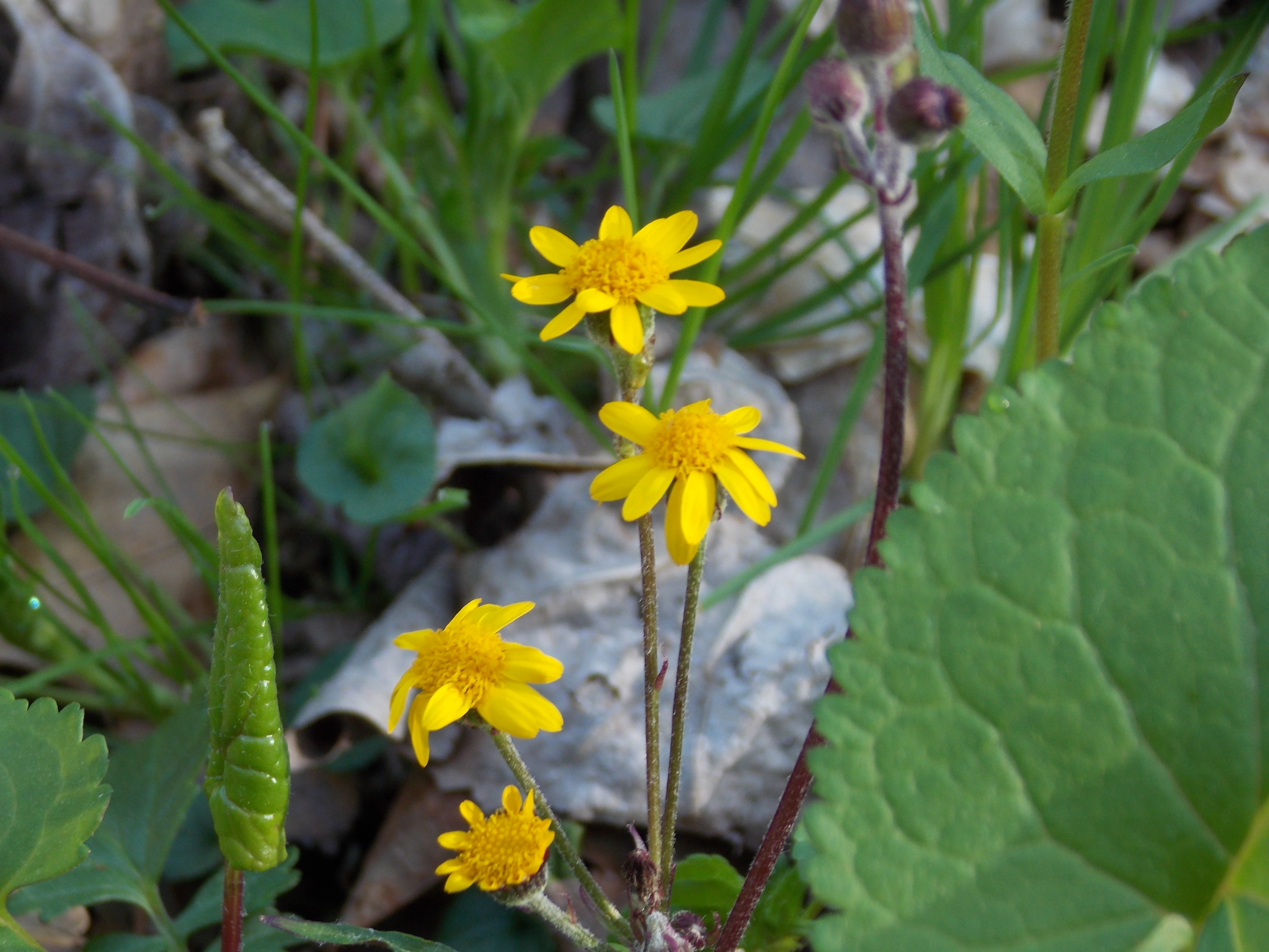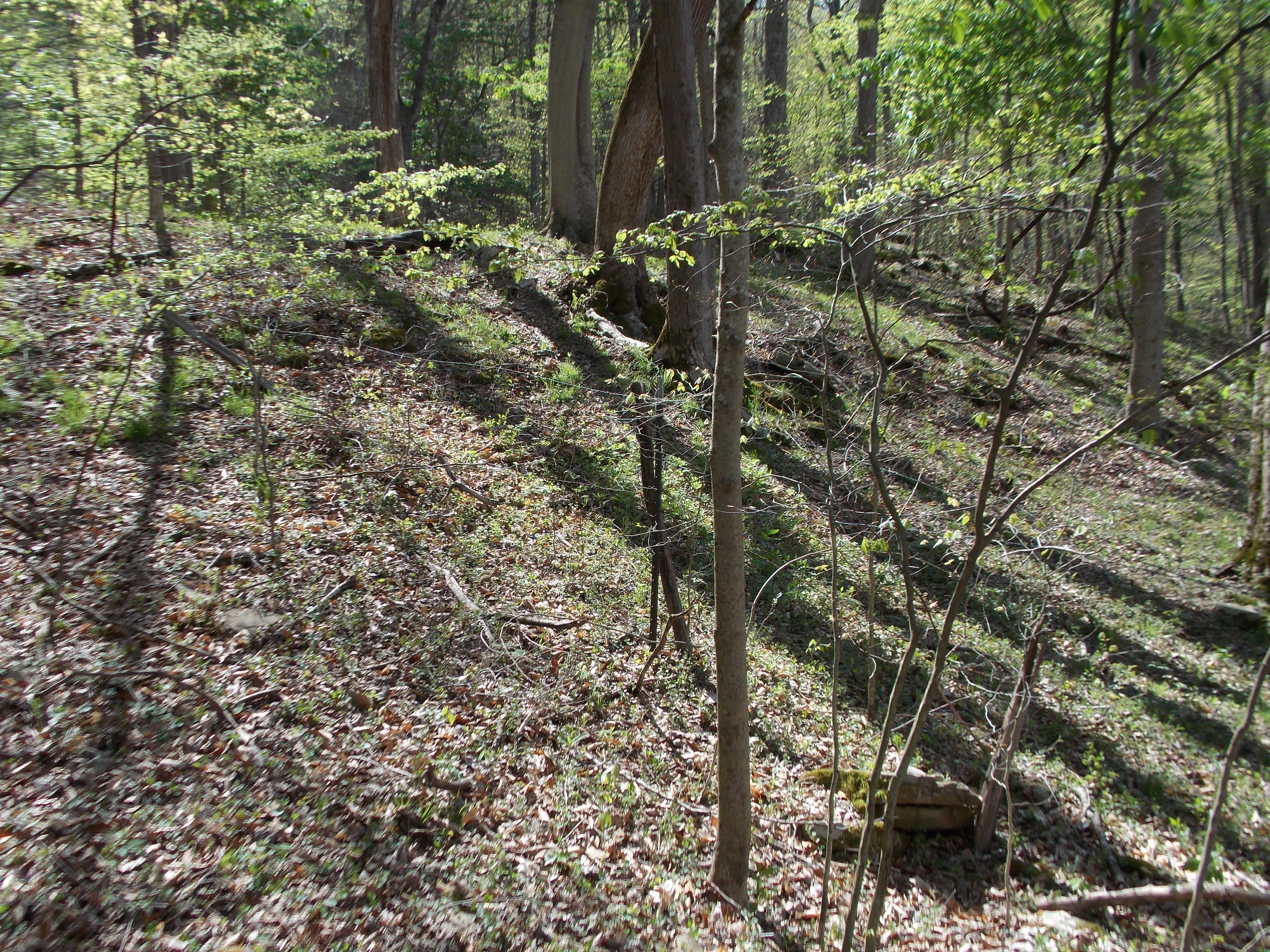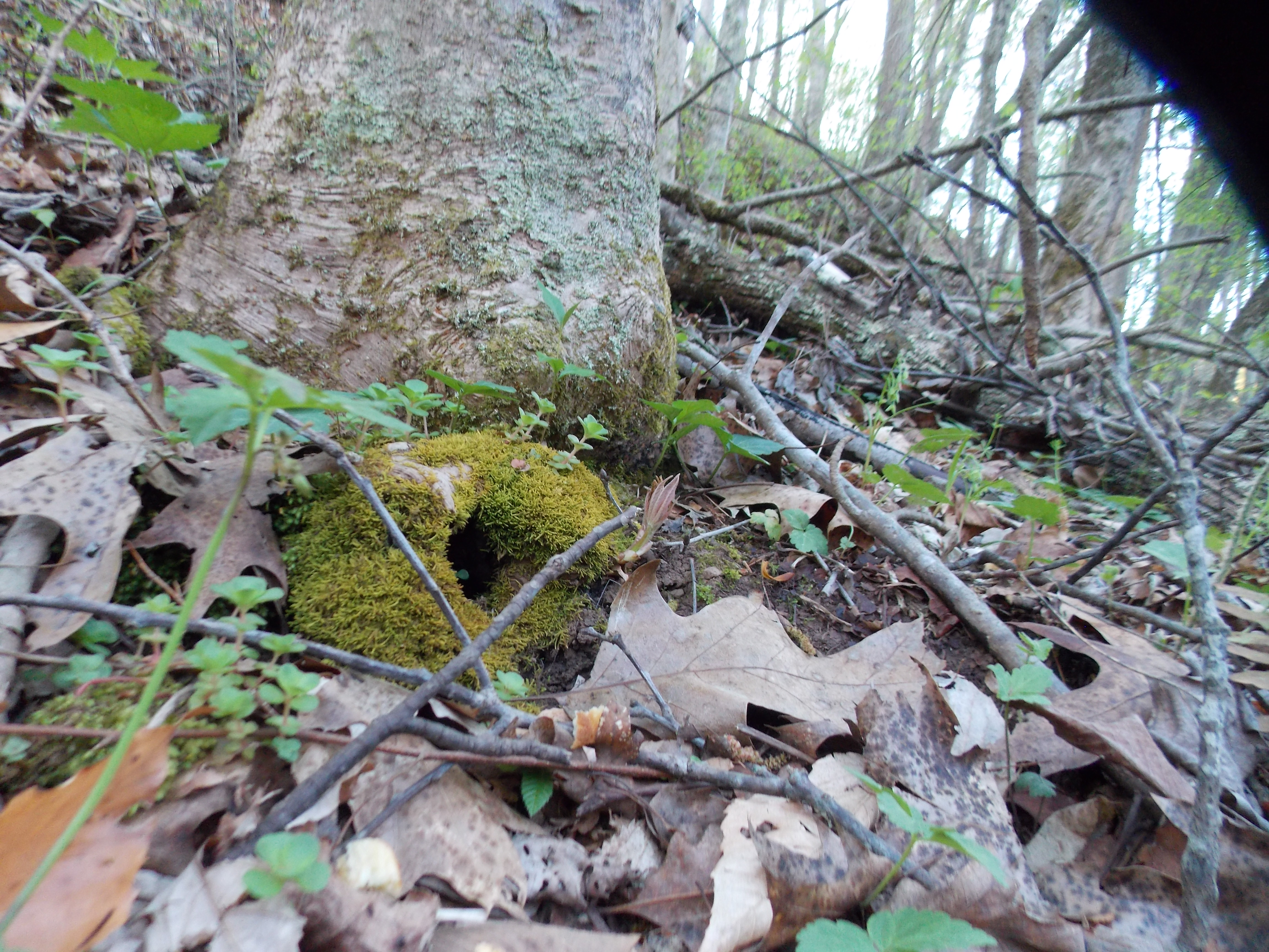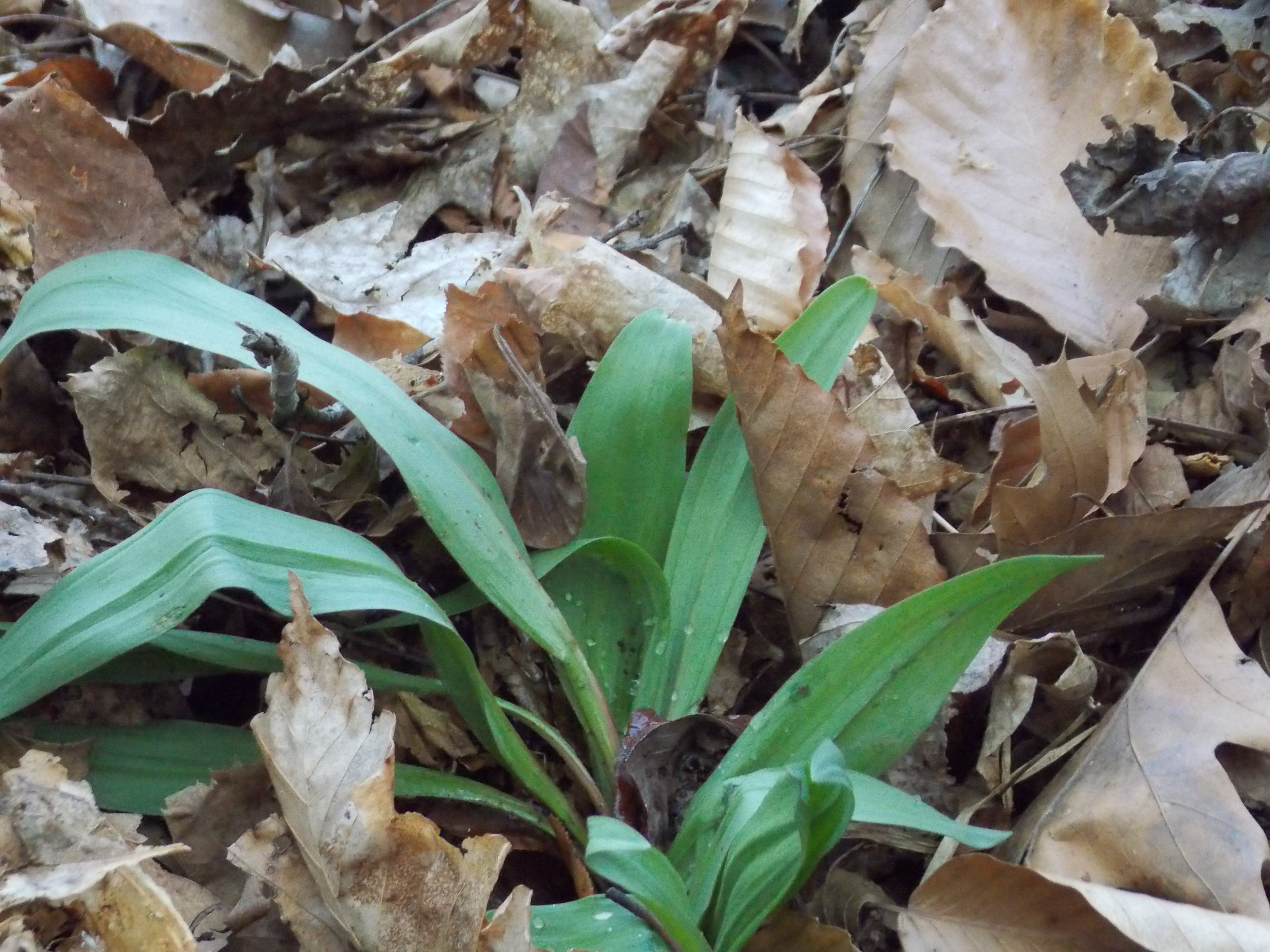 Things were dry but in a central depression, back uphill a bit, I found the kind of damp spot I’d been looking for. As far as I could tell, this property lacked ramps, something no Appalachian property should lack and I was prepared to rectify this. Reaching into the bucket and opening the paper bag inside, I took clusters of ramps I’d brought, 5 at a time and, using my trowel, planted 12 clusters all around the almost-pond. Ramps transplant easily, I’ve been told. We’ll see, as this is my first time doing it.