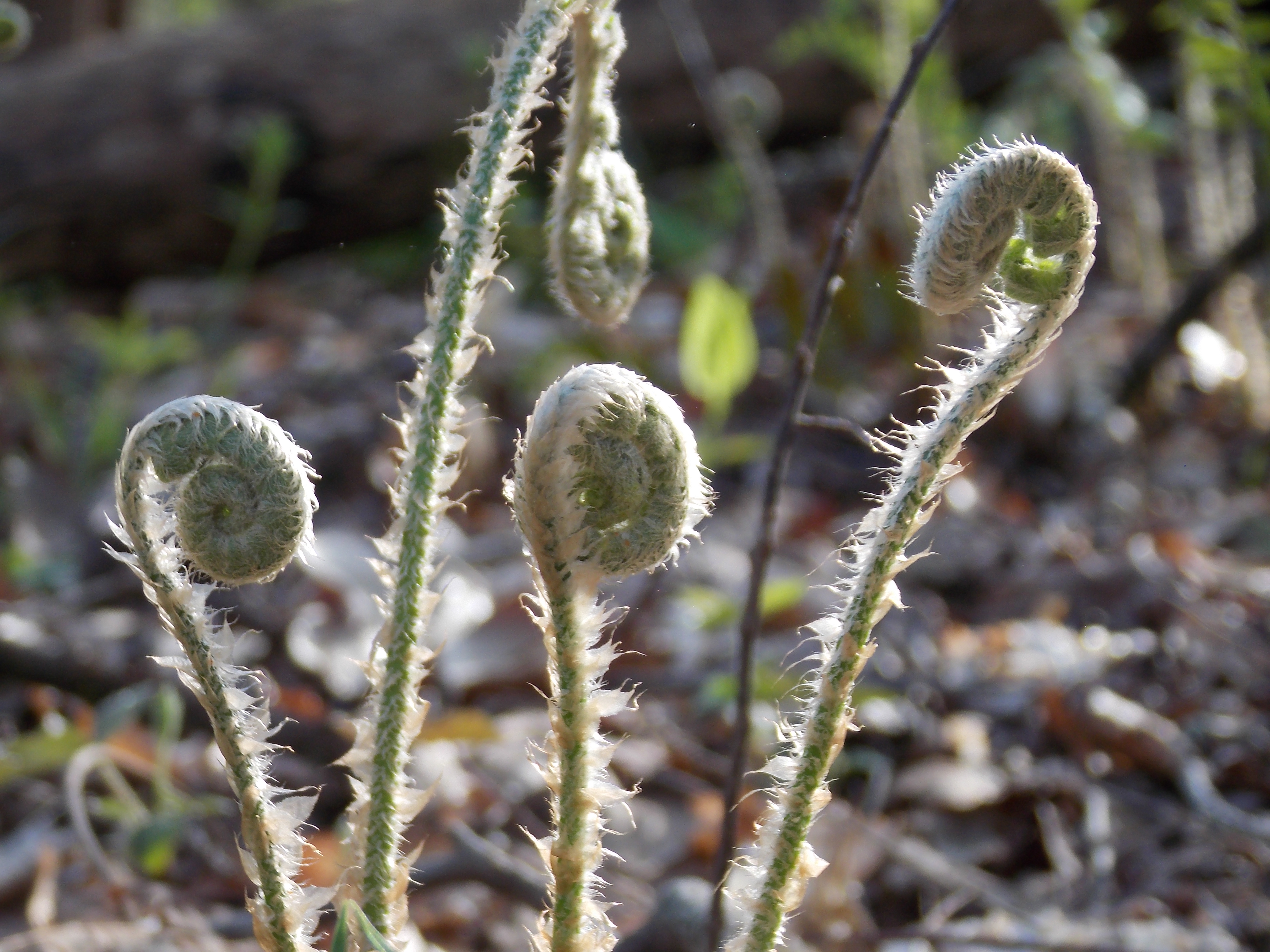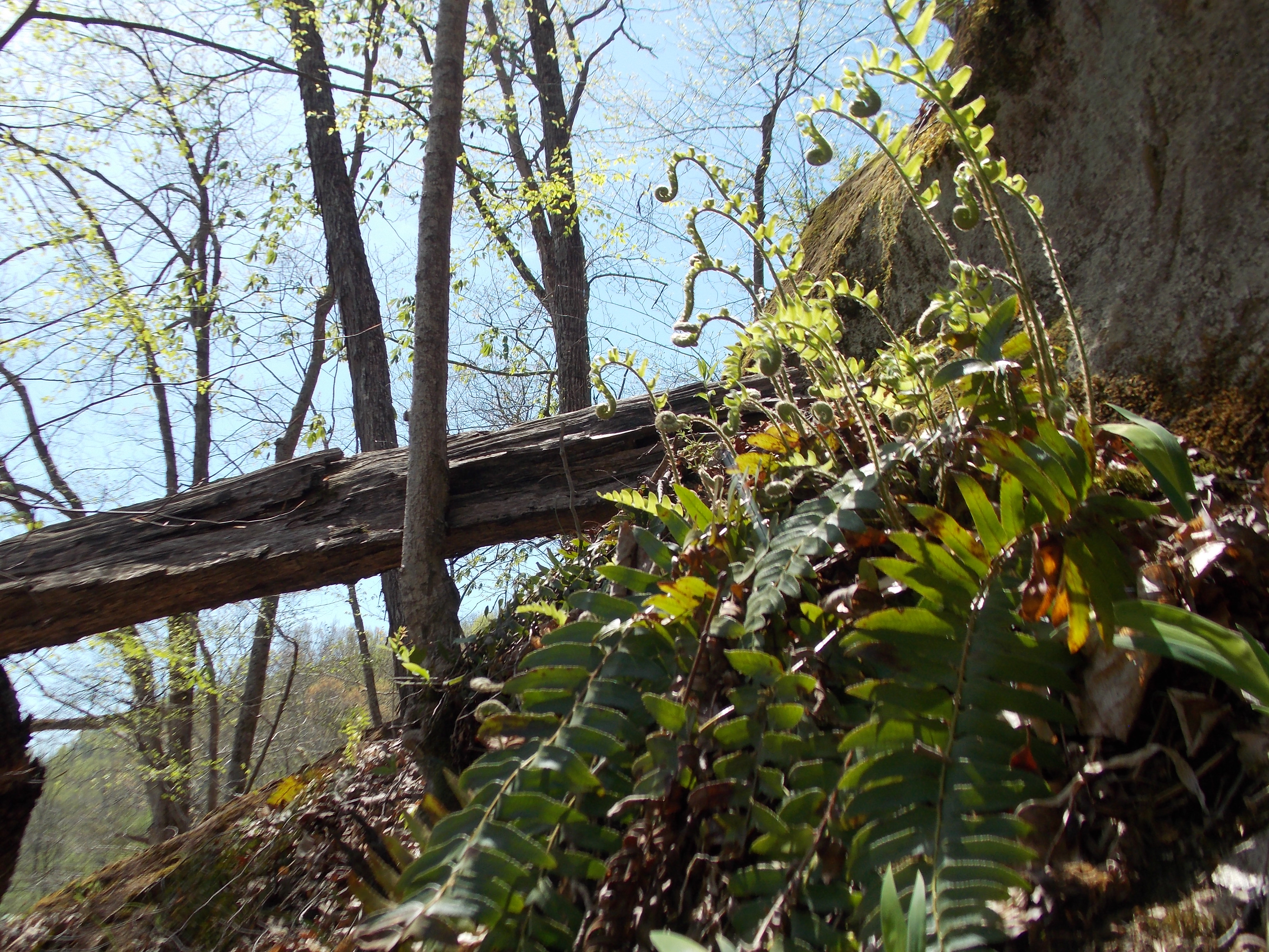 My eyes were open for morel mushrooms and for ramps – that choicest of Appalachian delicacies. But this had been a dry April and neither were evident. I wandered along the first trail we’d cut through (the easy way) looking for my favorite edibles and finding neither. The ferns, however, seemed oblivious to the lack of water and were going ahead with their life-cycles on schedule, unfurling lacey fiddleheads above the moss. It seemed there were three species here, at least.