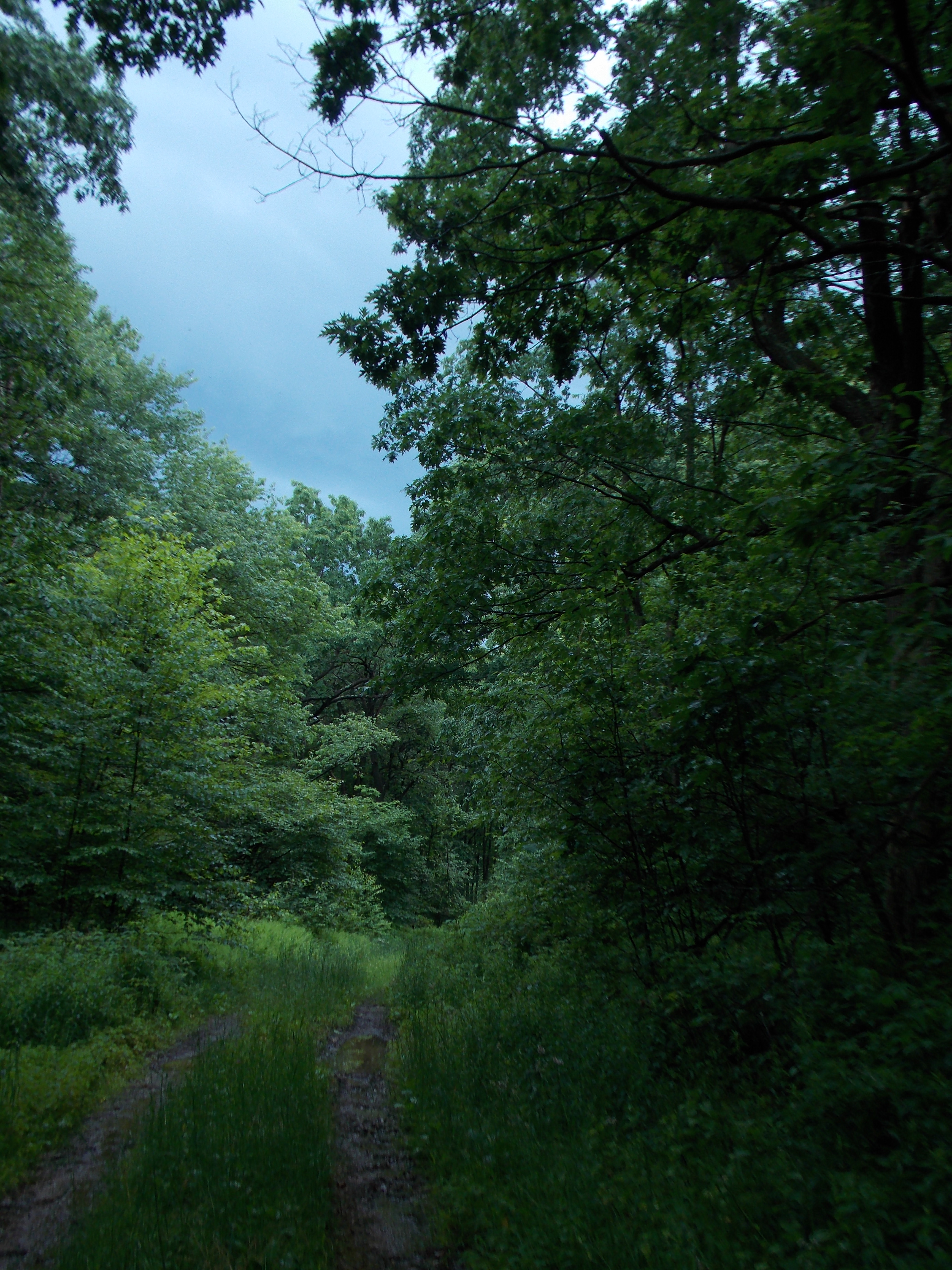 Before starting back I endured one rain shower, enough to convince me I was doing the right thing to leave the woods for today – this was a wet and uncomfortable place. But a mile or so back, I noticed a little trench in the woods heading downhill and away from my path, dry like everything else. I dropped the pack for a bit to have a look, a little thunder sounding now, warning of another drenching. I walked downhill just out of sight of the road and found a second trench meeting the first, but this one had water flowing along the bottom! It was just a spring, too small for fish, but it was flowing water.