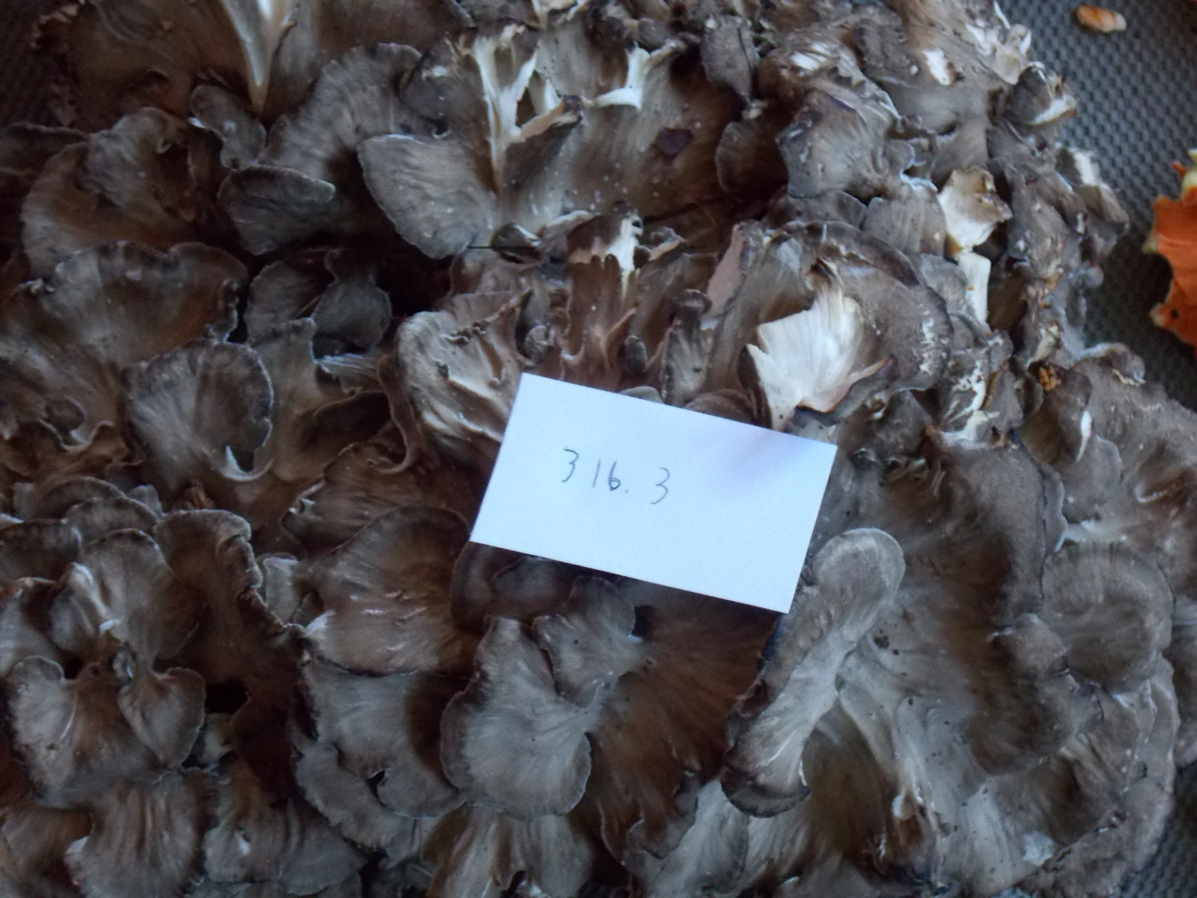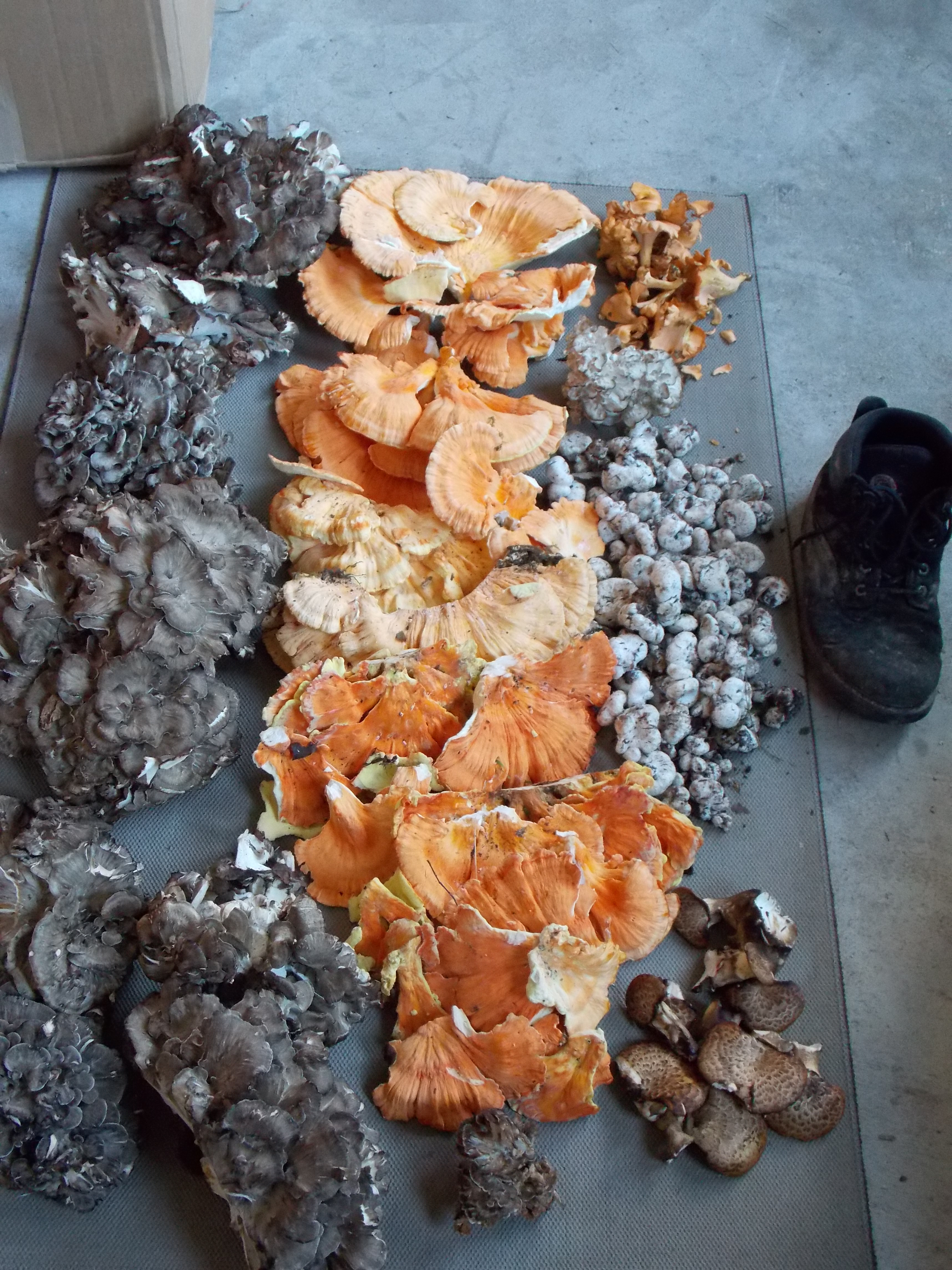 Back at my kitchen I cleared the table and laid out about thirteen pounds of mushrooms. No, I had no idea how much I could realistically consume and no idea how to preserve the stuff for future use. If I had, I might have carried off three pounds in my bag rather than thirteen. Later, I found that I liked Chicken of the Woods but I found that I liked Hen of the Woods (the drab giant prize at the end of my hike) even better.