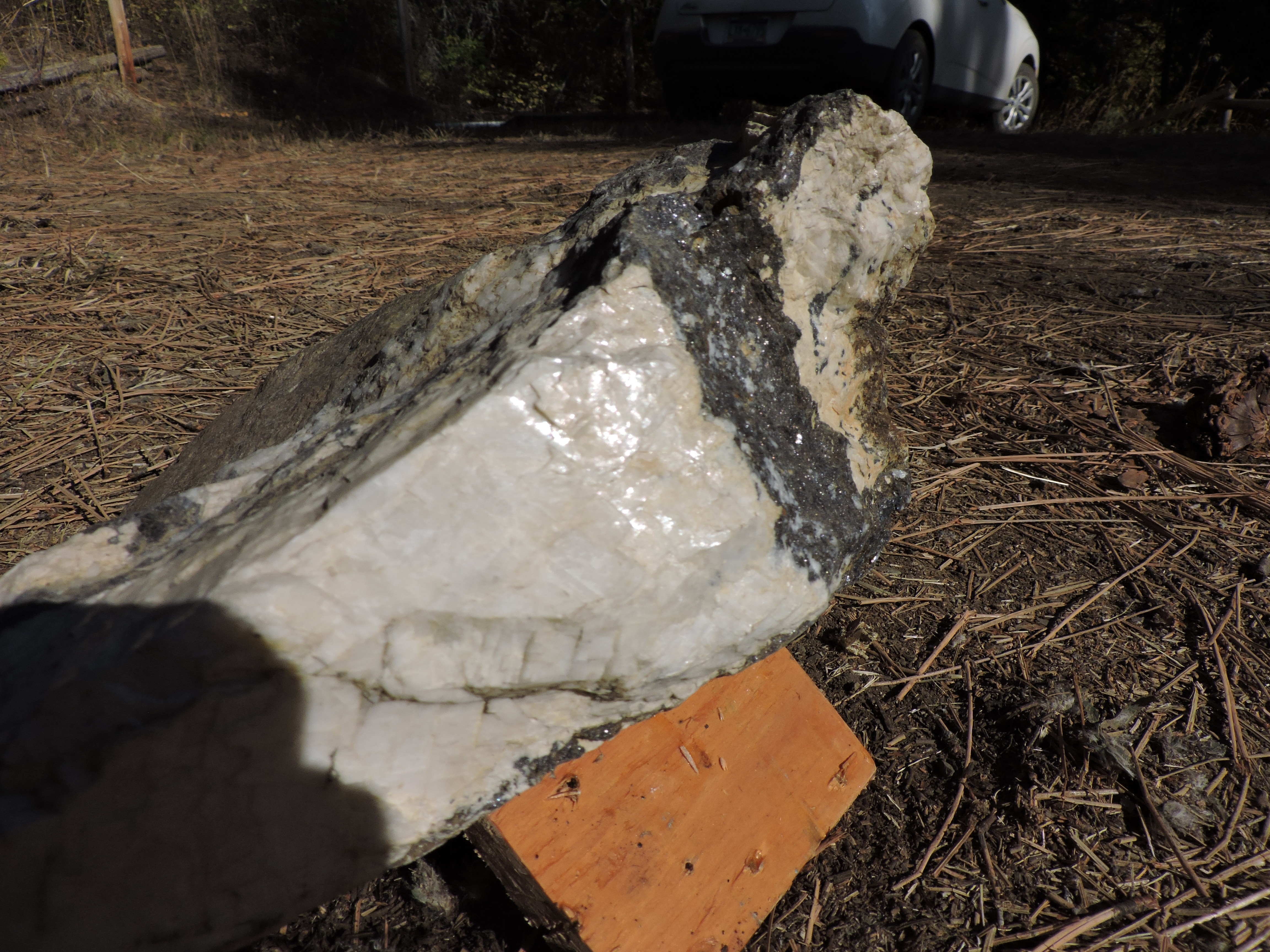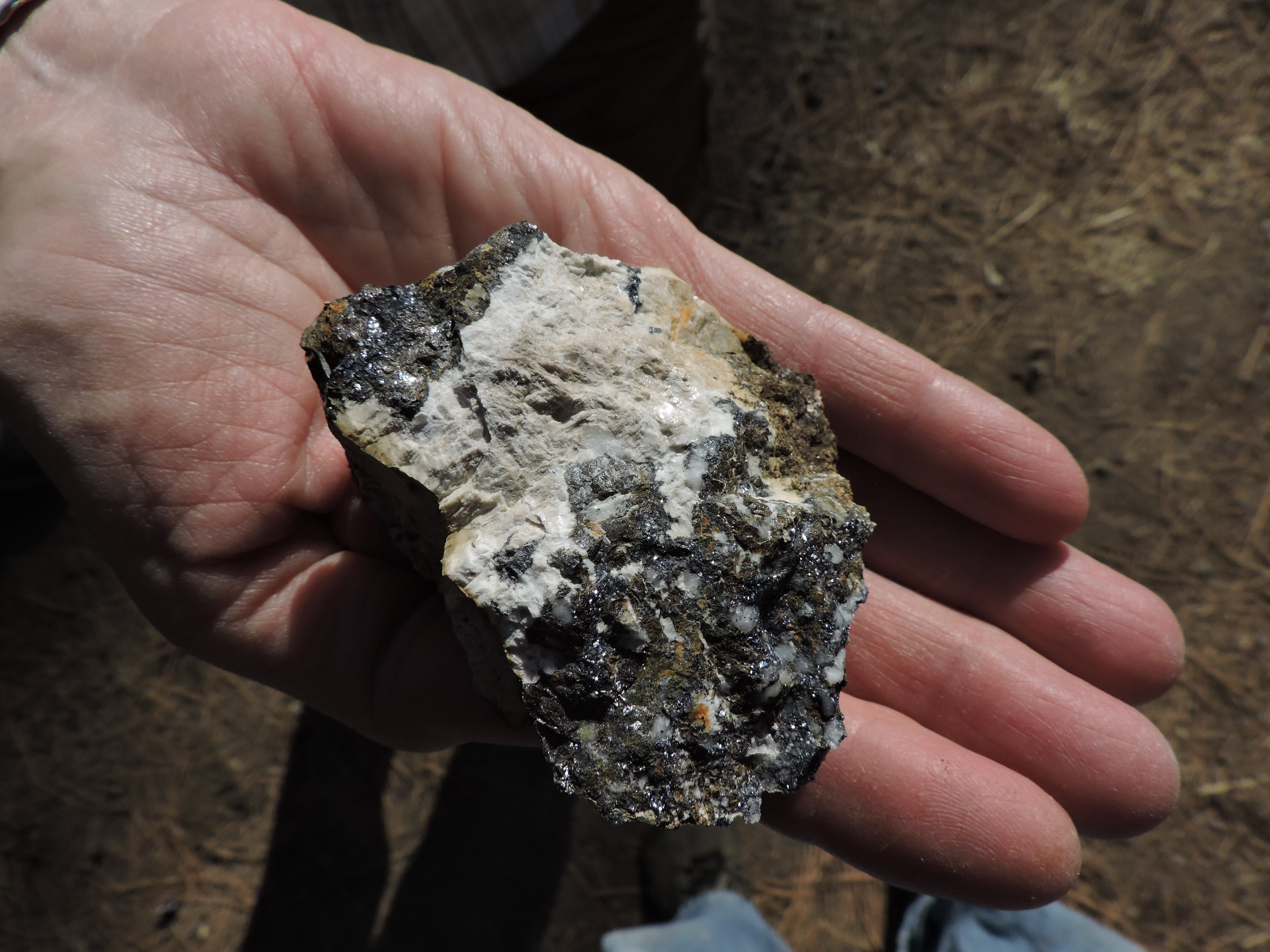 We stopped at Dwight’s own little camp in the woods, a place he’d been putting some work into recently, and admired his craftsmanship. He rolled a small boulder over just alongside the stairs and told us that this chunk of what seemed to be white quartz contained a large amount of silver ore and just a little gold too. He then reached for a hammer and whacked off a corner of this rock, weighing probably a few ounces and handed it to us. Silver sparkled in the afternoon sunlight and we’d just been handed one of the very best stones we’d collect on the entire trip.