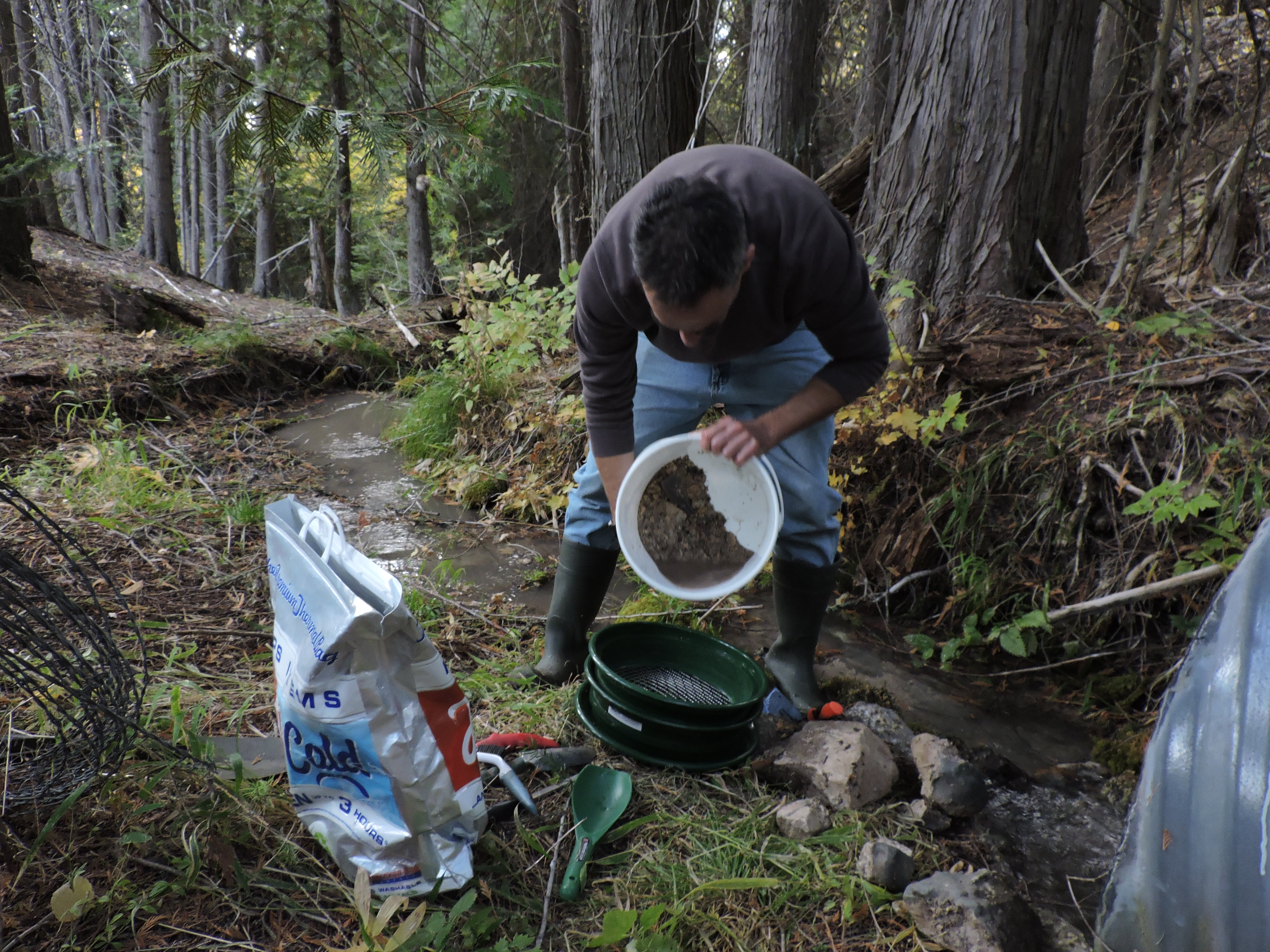 The next morning, Dwight did oblige us and we all piled into his car for a ride up into the woods near the Canadian border. We had a little trouble finding a good site, with plenty of access and plenty of gravel, but finally we did find a spot near a bridge which fit the bill. A small but working gold mine could be seen just downstream. And so, we busied ourselves with sifting of material through the classifiers and sloshing, swishing and swirling tiny rock fragments around and around in our pans. It was a first try and we didn’t expect much but we did find, among the heavy material left when everything else had been swished out of the pans, some tiny yellow rocks. And by tiny, I mean approximately sand-size. Sand-size or smaller. None of it was likely gold. But just maybe…