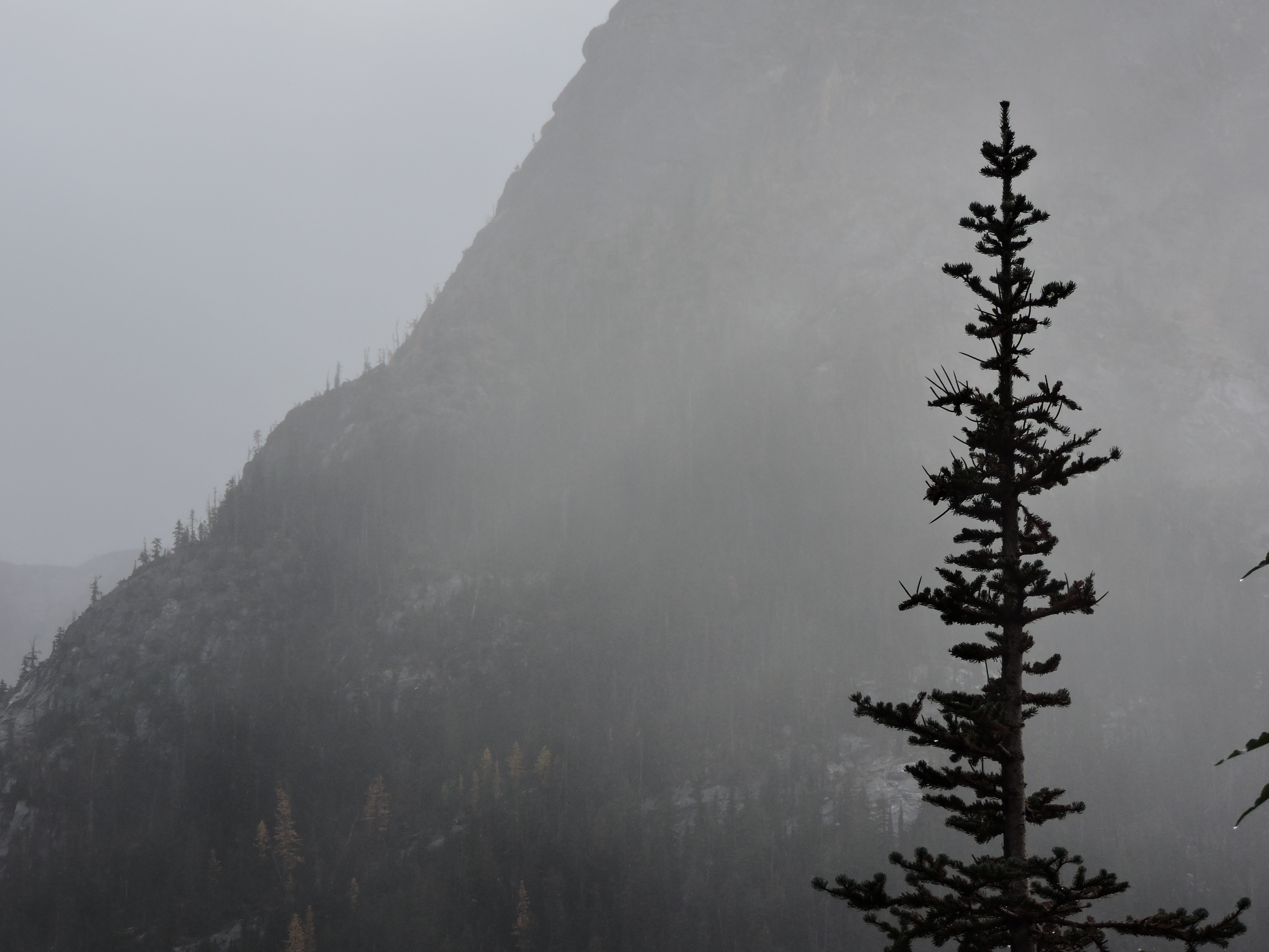 Little of minerological significance transpired at Winthrop or the drive on across the mountains to the coast. That is, unless you count the 7,000 + foot stone monoliths of the Cascades as “mineralogical.” Since I’ve been traveling to the west, people have advised over and over that I needed to see the northern Cascades and that this was simply one of the most scenic places in existence. This proved to be true and I think that we couldn’t have picked a finer day on which to see these promontories for the first time. Snow was threatening, and even falling at times, but the road was never more than wet and we were able to view newly snow-draped elephantine peaks as shafts of light passed between the storm clouds. I’d take this over a sunny afternoon any time.