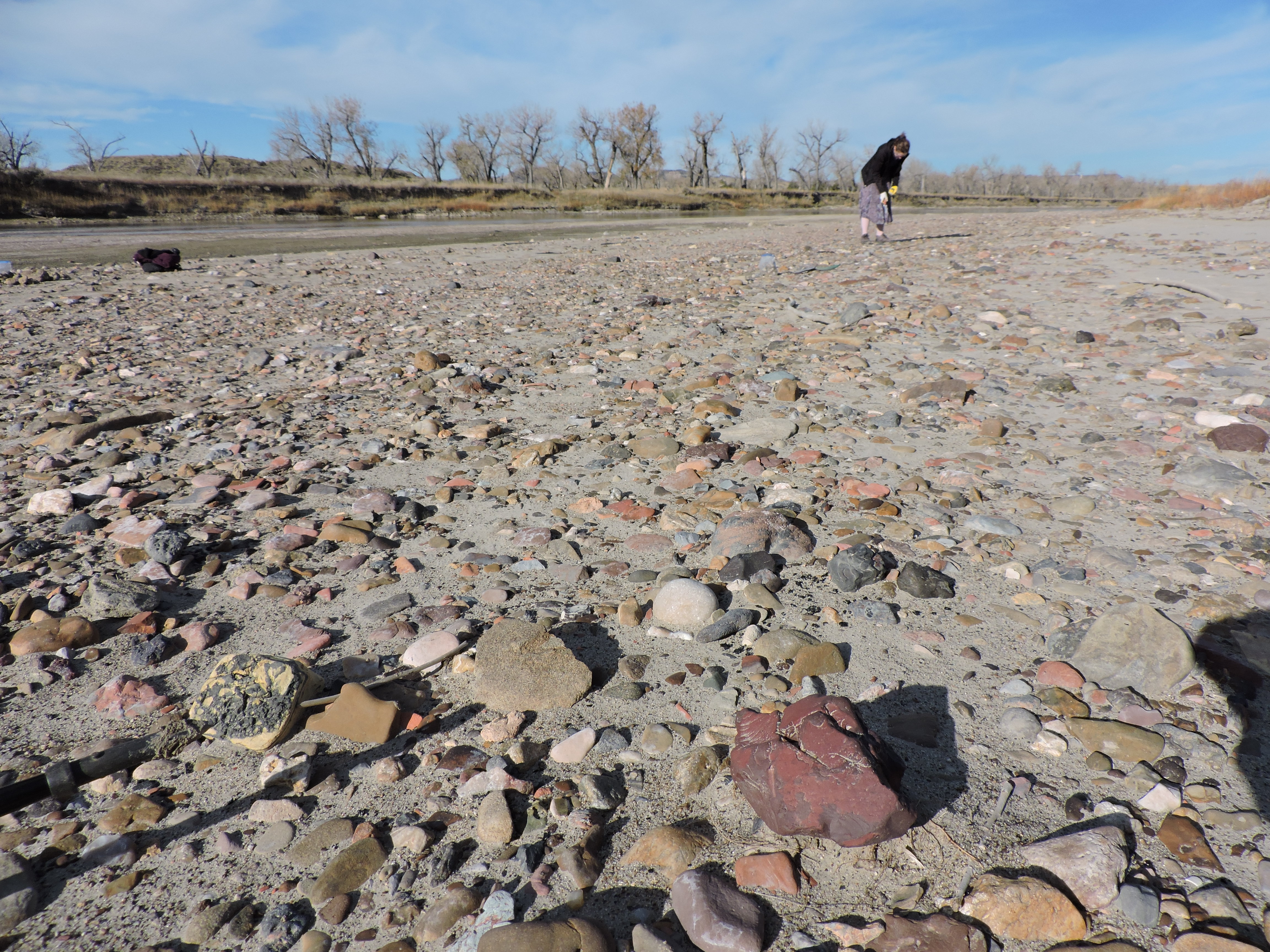 We drove on toward North Dakota in the morning, through a more “badland” kind of region of stark and odd little buttes and eroding upright rock formations of all shapes and sizes. If there were good rocks to be found anywhere, this would be the place. We stopped at the Powder River to take a look. Susan wasn’t excited about the climb down but I cajoled, pleaded and finally assisted in the effort to get Susan down onto the broad gravel bars below us. I just had a good feeling about this.