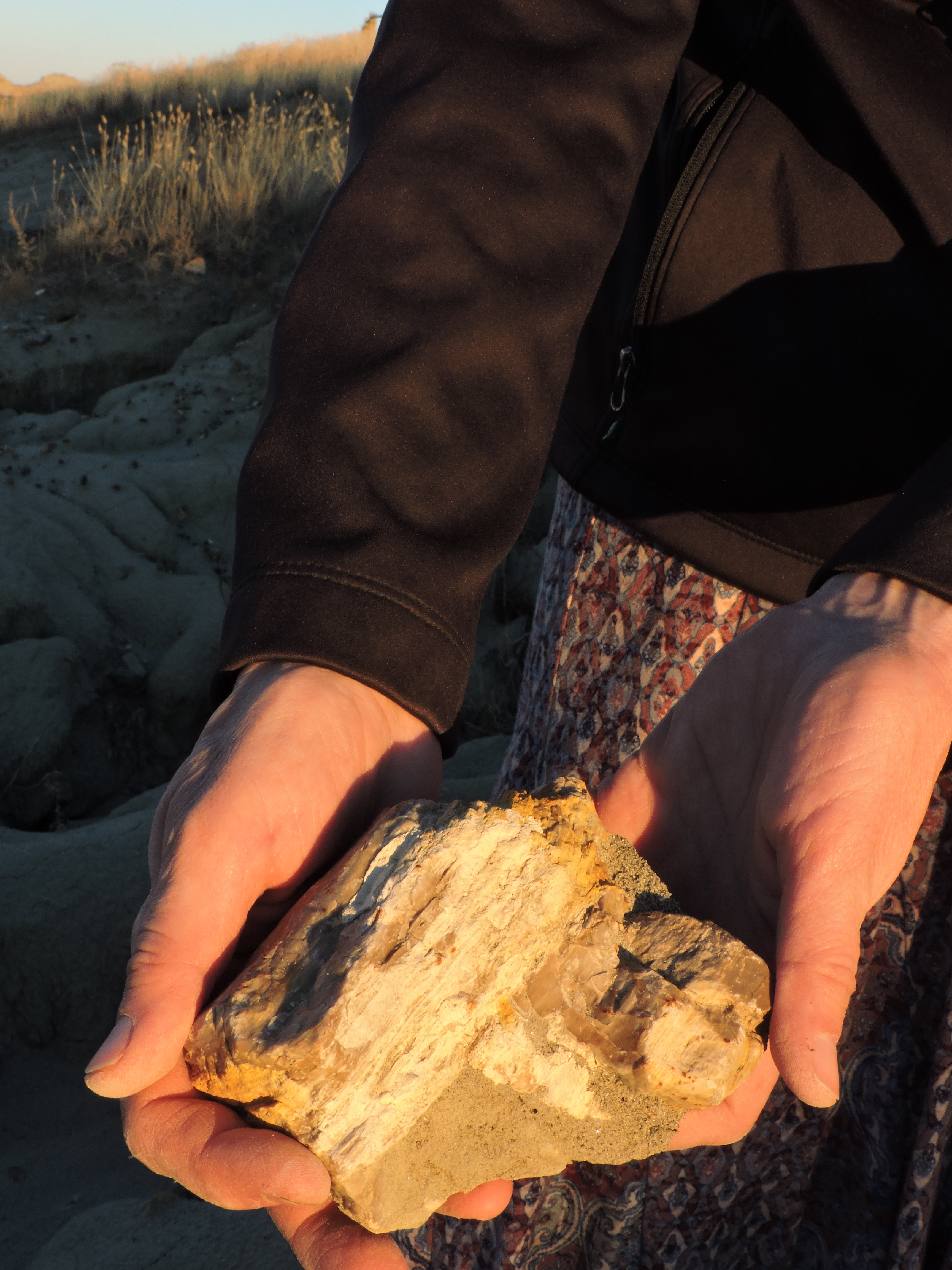 An hour or so later, having said our good-byes again for this year, Susan and I were working along a roadside wash-out on the outskirts of Marmarth. Shards of petrified wood glinted in the low-angled evening sunlight, emerging from this well-weathered clay hillside. We couldn’t have been happier. Susan seemed completely immersed in her “work” and I was more than happy to see that she had no desire to rush or to leave Marmarth too soon. I hadn’t known how Susan would take to all this. Before leaving home, I hadn’t known how I’d take to all this. It had been an awfully long time since I’d looked around at the rocks around me and I’d never, to the best of my knowledge, actually picked up an agate before. But there was an undeniable fascination and maybe even an addiction – the very best sort of addiction – that came along with all this. It was time to move on but neither of us really wanted to move on.